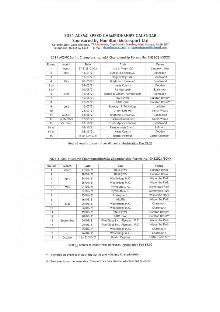 Provisional 2021 ACSMC Speed Championships Calendar announced